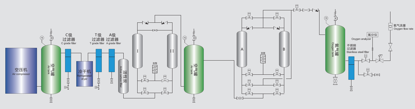 Dopo che l'aria è stata compressa dal compressore d'aria, dopo la rimozione della polvere, la rimozione dell'olio e l'essiccazione, entra nel serbatoio di stoccaggio dell'aria, entra nella torre di adsorbimento sinistra attraverso la valvola di aspirazione dell'aria e la valvola di aspirazione sinistra, la pressione della torre aumenta, le molecole di azoto nell'aria compressa vengono assorbite dal setaccio molecolare di zeolite e l'ossigeno non assorbito passa attraverso il letto di adsorbimento e entra nel serbatoio di stoccaggio dell'ossigeno attraverso la valvola di produzione del gas sinistra e la valvola di produzione del gas ossigeno. Questo processo è chiamato aspirazione sinistra. La durata è di circa sessanta secondi. Dopo la fine del processo di aspirazione sinistro, la torre di adsorbimento sinistra e la torre di adsorbimento destra sono collegate tramite la valvola di equalizzazione della pressione, in modo che la pressione delle due torri sia bilanciata, questo processo è chiamato equalizzazione della pressione e la durata è compresa tra 3 e 5 secondi. Al termine dell'equalizzazione della pressione, l'aria compressa entra nel serbatoio dell'ossigeno attraverso la valvola di aspirazione dell'aria e la valvola di aspirazione destra. Questo processo è chiamato giusta aspirazione e la durata è di circa sessanta secondi. Allo stesso tempo, l'ossigeno assorbito dal setaccio molecolare di zeolite nella torre di adsorbimento sinistra viene rilasciato nell'atmosfera attraverso la riduzione della pressione della valvola di scarico sinistra. Al contrario, quando la colonna di sinistra adsorbe, anche la colonna di destra desorbe. Per scaricare completamente nell'atmosfera l'azoto rilasciato dalla decompressione nel setaccio molecolare, l'ossigeno viene convogliato attraverso una valvola di soffiaggio inverso normalmente aperta verso la torre di adsorbimento di desorbimento e l'ossigeno nella torre inversa viene espulso dalla torre di adsorbimento. Questo processo è chiamato contraccolpo e va di pari passo con il desorbimento. Dopo la fine dell'aspirazione destra, accedere al processo di bilanciamento della pressione, quindi passare al processo di aspirazione sinistra e continuare il ciclo.